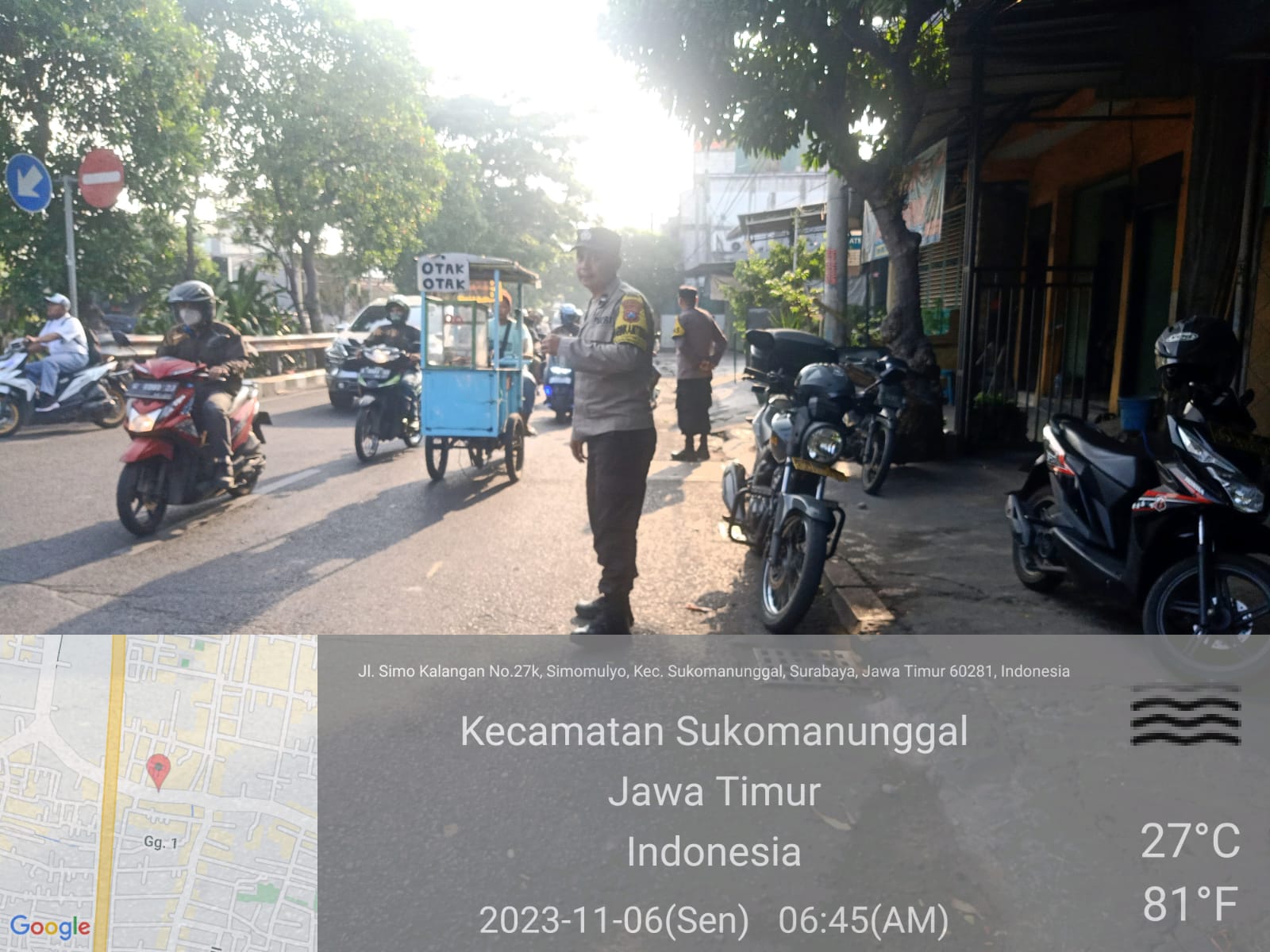 Kanit binmas bersama Piket bhabin giat pos awal di u tern psr asem Surabaya untuk arus lalulintas lancar.