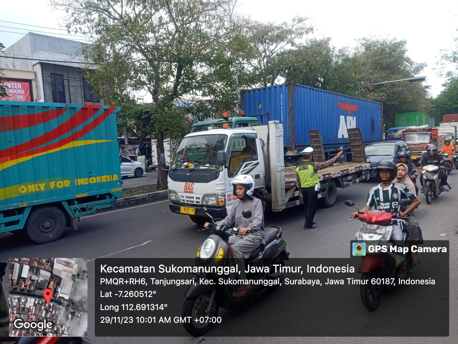 Sukomanunggal 12.02 Serta Sukomanunggal 12 IPDA HARI SUDARSONO Mendatangi Tkp Truk Trailer Berhenti ditengah jalan Akibat Kopling Rusak di TL Tanjung Sari Jl. Raya Sukomanunggal Kec. Sukomanunggal Surabaya.