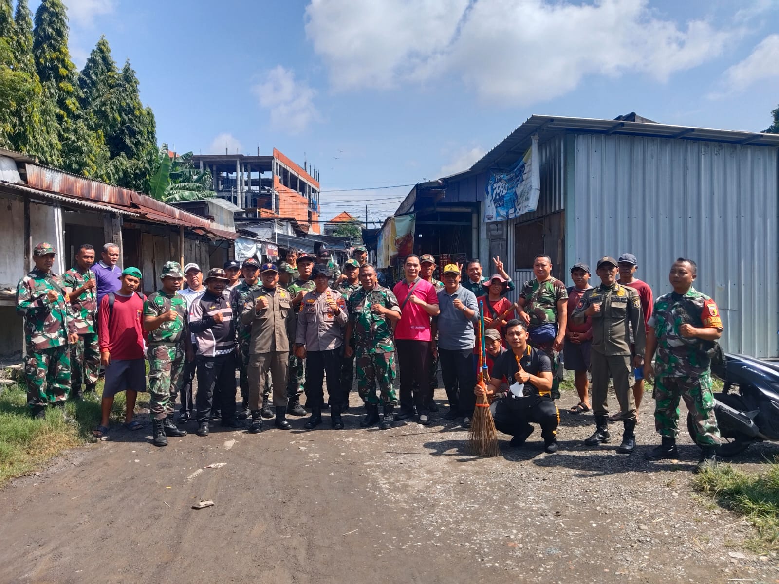 Puluhan personel terdiri dari gabungan TNI-Polri dan Pol PP Kecamatan Lakarsantri turun langsung melaksanakan kerja bakti bersama di kawasan PD Pasar Surya Lakarsantri, Surabaya, pada hari Jumat pagi 6 Februari 2026.